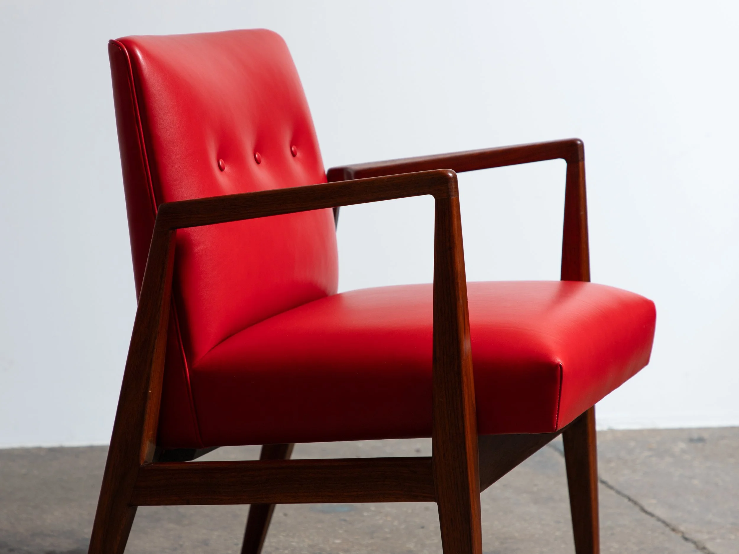 Pair of poised and elegant Model 1103 armchairs, designed by Jens Risom for his eponymous company, Jens Risom Design Inc. Showcasing the designer’s fusion of Scandinavian and American design principles, these chairs feature angular walnut wood frames with sculptural details. The plush cushions are inviting, with tufted buttons adding a polished touch to the backrest. Sculpted armrests and tapered legs have been recently polished to a rich and gleaming finish. Crafted with precision, these chairs reflect the enduring quality of Jens Risom's design. Impeccably restored and ready for placement, they are upholstered in bold, top-quality Maharam leather. 1950s.