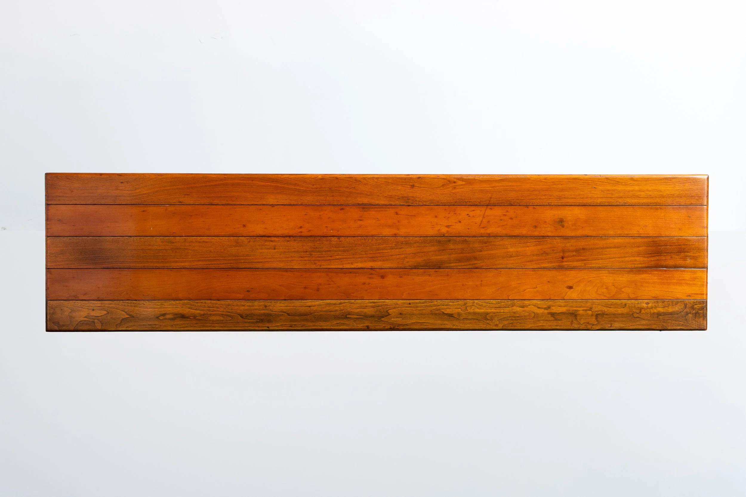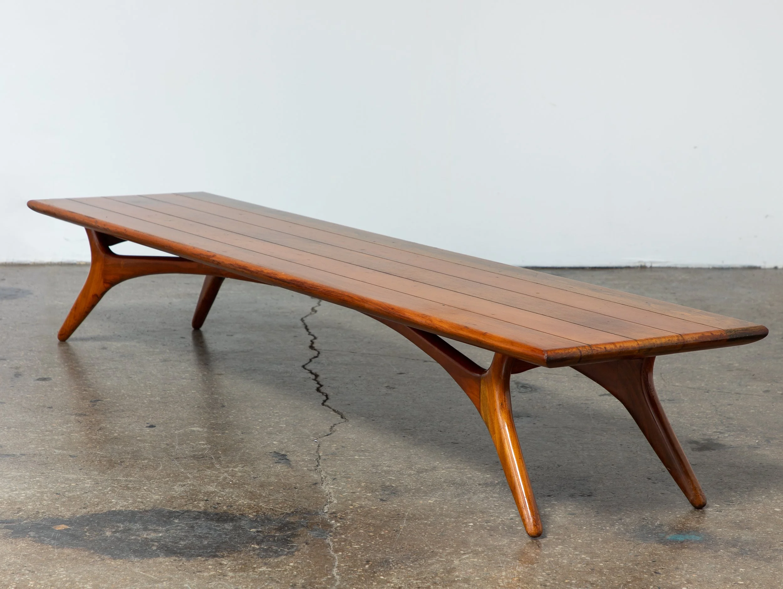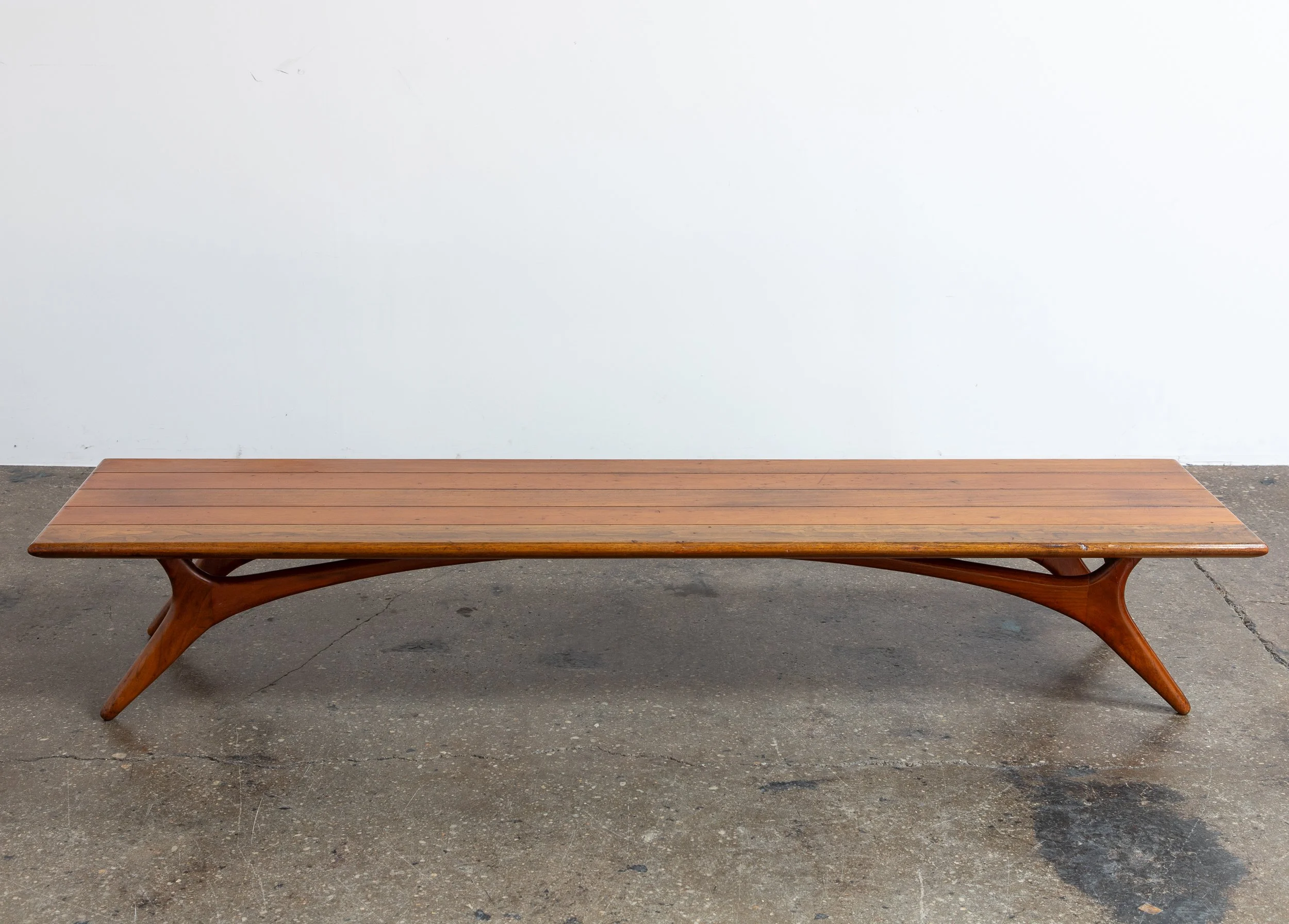 Original Vladimir Kagan bench for Grosfeld House. Both sculptural and functional, the design conveys a sense of movement in wood. The base is carved in a sculptural arc, its angled struts giving the bench a poised, elevated stance. The plank top is constructed of five boards with softened corners and edge-lipped ends, floating just above the frame with a slight bevel. This design reflects the early American modern shift away from rectilinear mass toward organic dynamism, situating Kagan as a counterpart to contemporaries like Nakashima and Wormley. Rare to find this form in solid walnut with such well-preserved age and surface character.